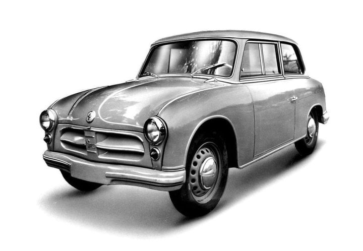První z řady vozítek z bývalého východního Německa spatřilo světlo světa ještě v továrně, pamatující ctihodného Augusta Horcha. Na konci čtyřicátých let se v poničených budovách začala pomalu rozbíhat montáž někdejších dvoudobých DkW F8.