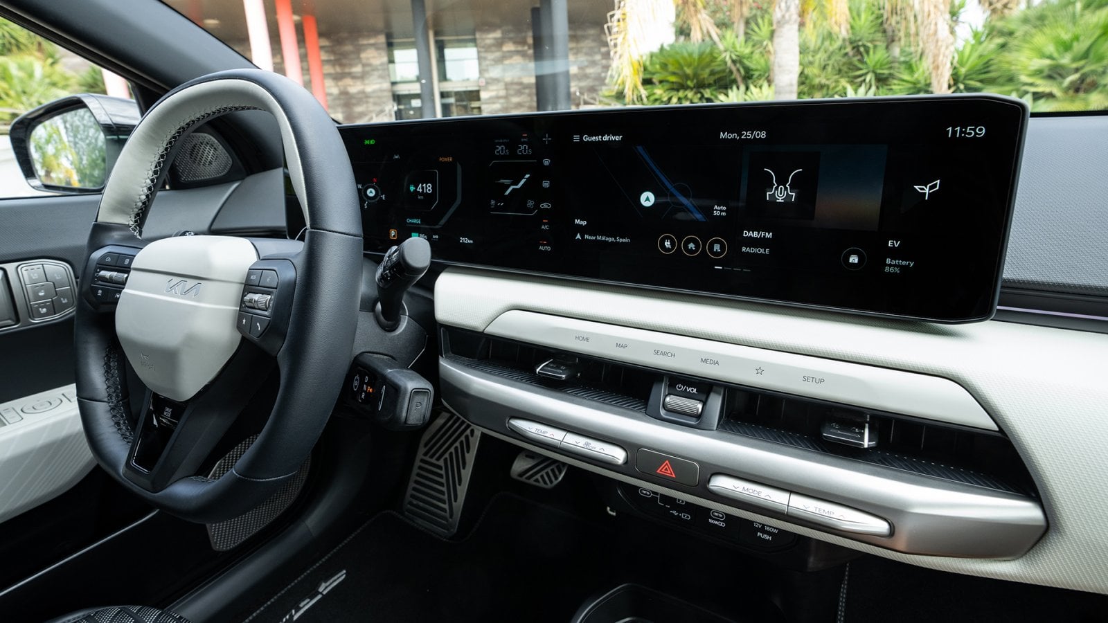 Během tiskové konference jsme měli možnost se krátce svézt s variantou hatchback. Oproti SUV modelu EV3 se výrobce chlubí o 4 cm nižší pozicí za volantem a o 2 cm nižším těžištěm. I přes přítomnost baterie se sedí skutečně poměrně nízko a pozice za volantem je velmi pohodlná. Pohonnou jednotku už známe z modelu KIA EV3 – 150 kW je na takové auto zcela dostačujících. EV4 krásně reaguje na povely plynového pedálu, v autě panuje neskutečné ticho a nejen díky technickým inovacím na podvozku se krásně nese po silnici.