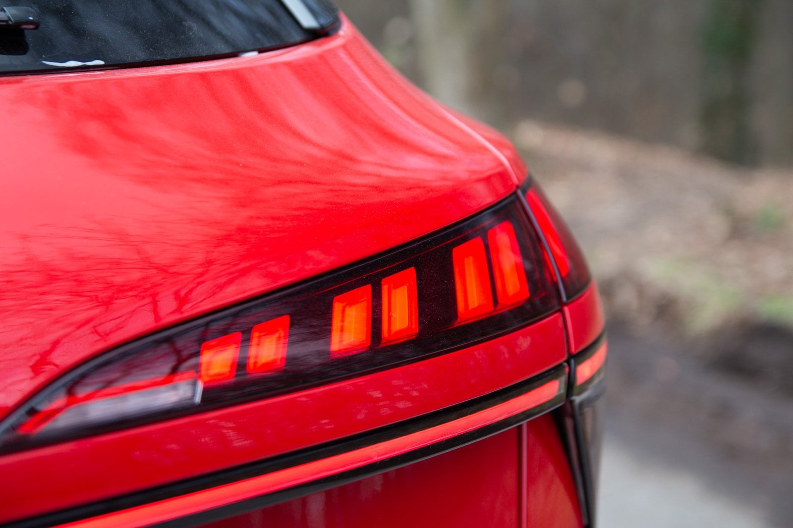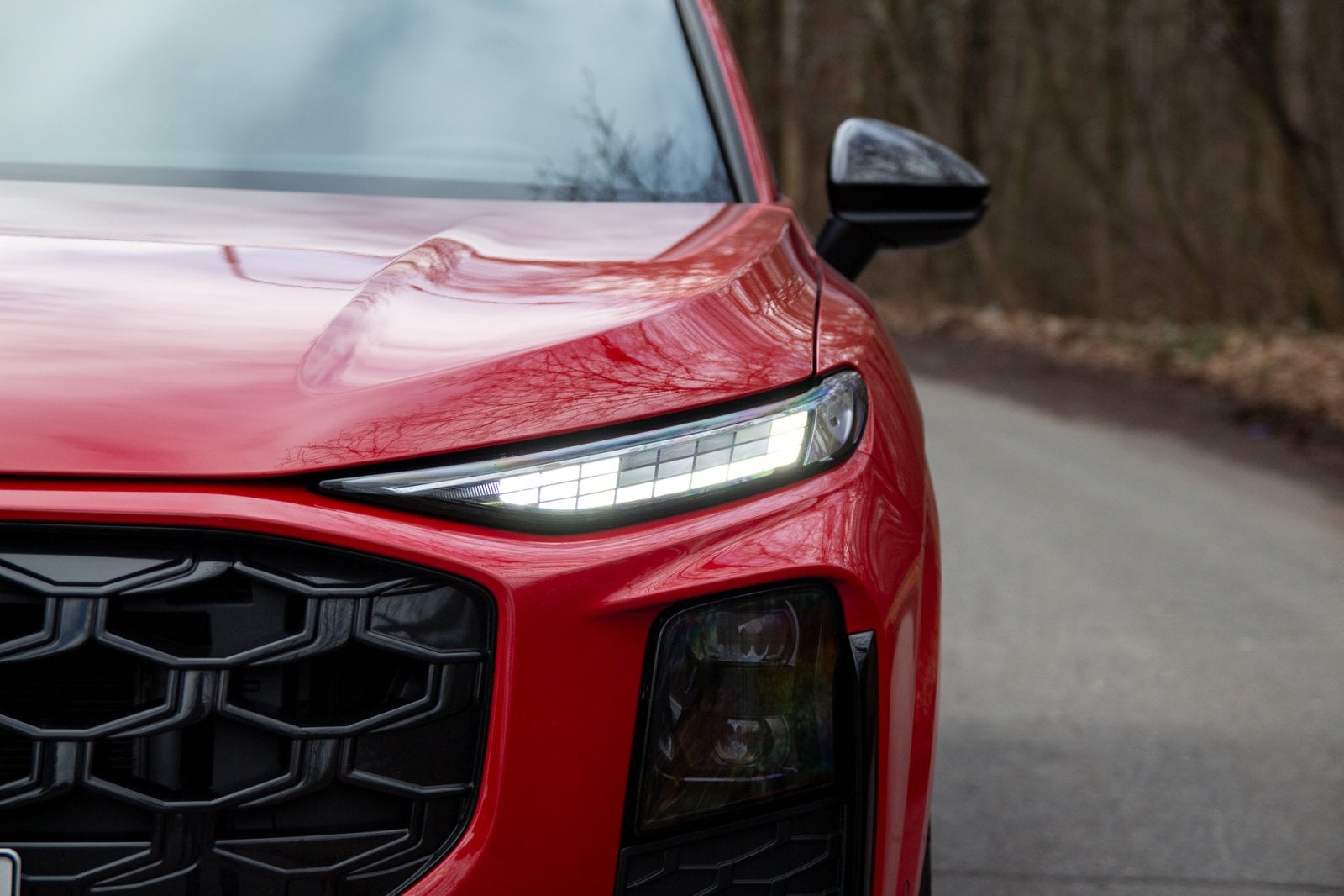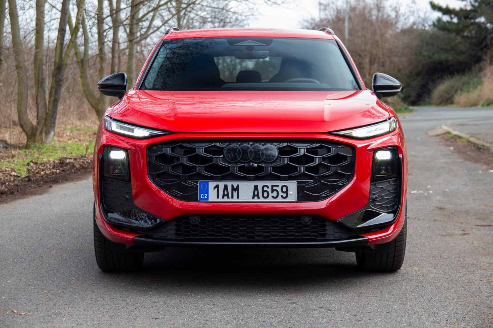 Stojí před námi nejnovější recept na ingolstadtskou eleganci. Přimhouřená světla denního svícení a chytře schovaná hlavní světla s LED Matrix technologií, žádný chrom a hodně černé obalené v sytě červené barvě. Vzadu úzké světlomety a dnes už povinná červená linka mezi nimi a samozřejmě osvětlené logo výrobce.