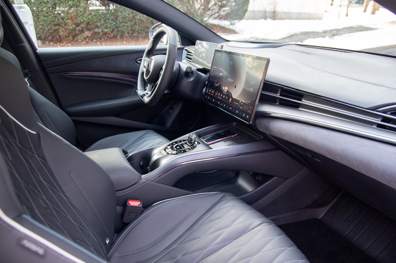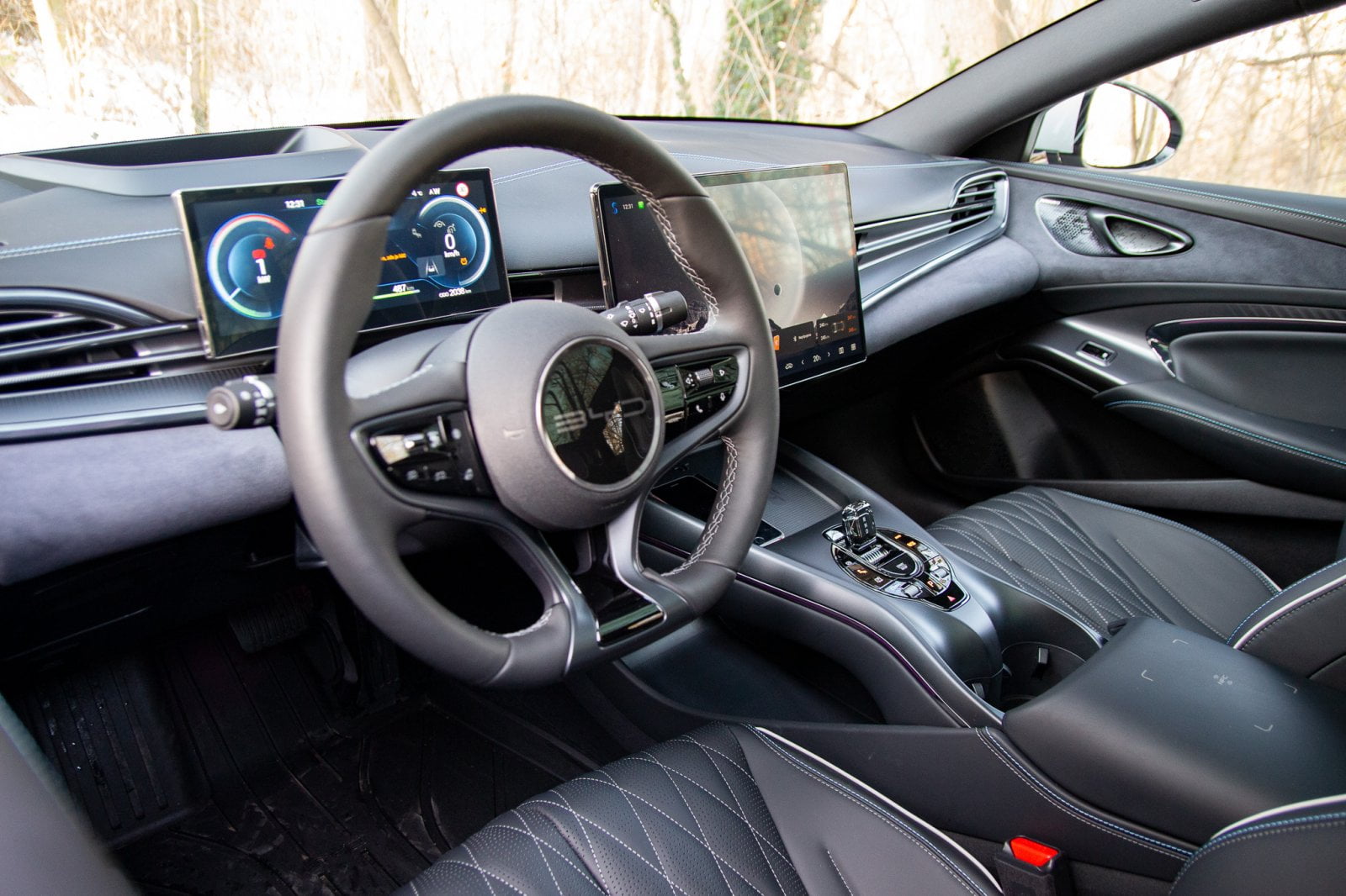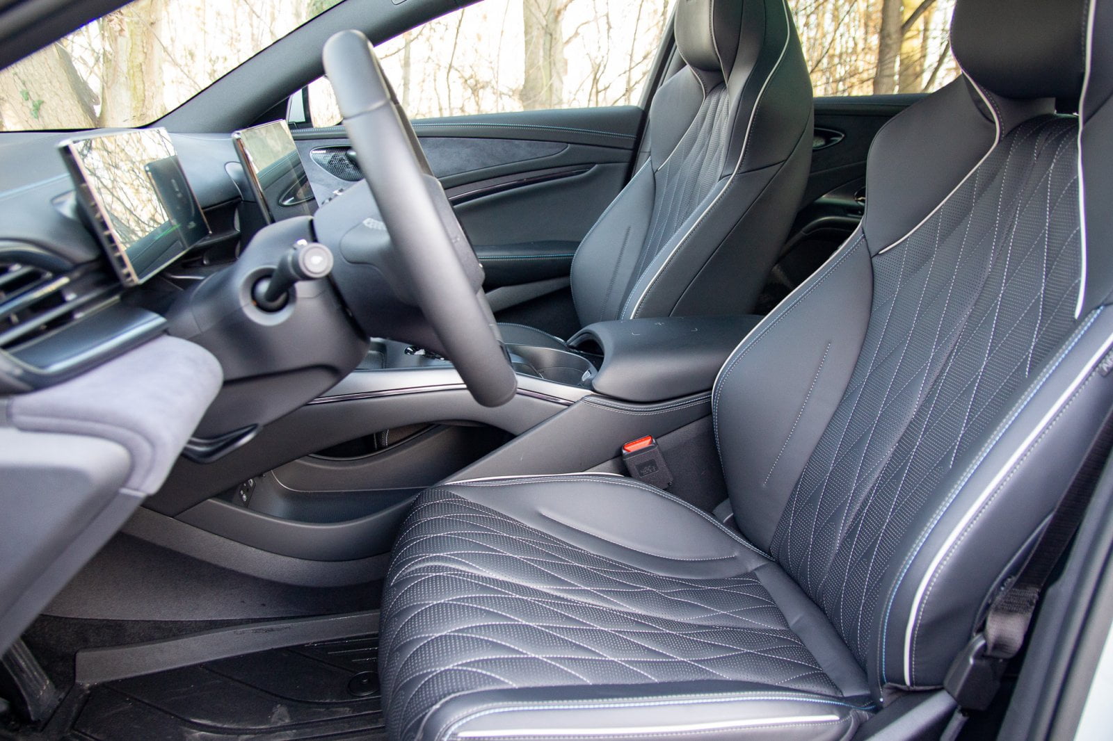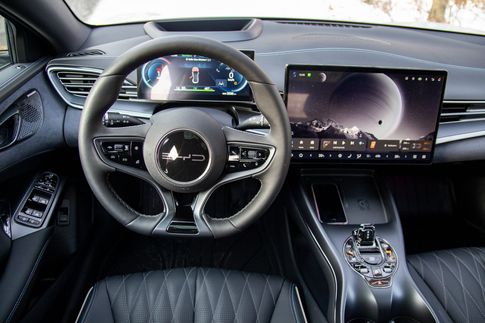Interiér už mi tolik srdce nerozbušil. Nevypadá zle, ale kombinace tvaru palubní desky a obřího displeje mi dech nevyrazila. Vadilo mi velké lesklé logo na volantu, málo kontrastní displej před řidičem a vlastně mě popuzuje i zbytečnost 15,6palcového centrálního displeje, který svou velikostí nijak nepomáhá ovládání. Ikony jsou pořád stejně malé a množství zobrazovaných informací by se vešlo i na displej poloviční velikosti.