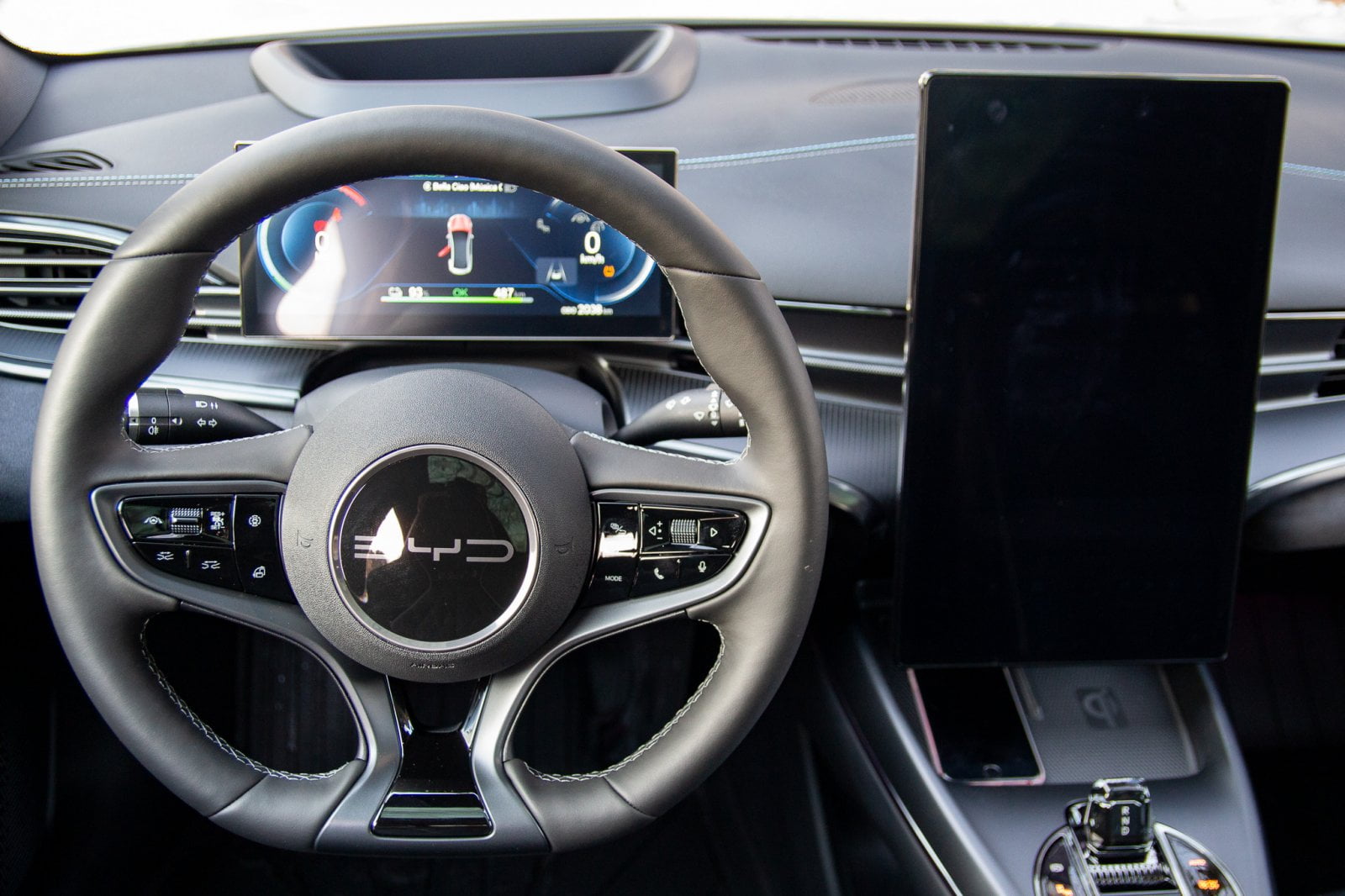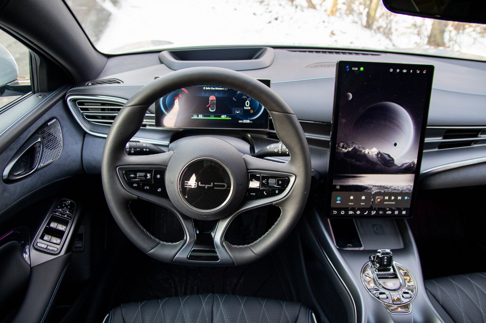 Usedám do nízkého interiéru, rukama chytnu tlustý věnec volantu, zařadím D a vyrazím. Elektromobilů už jsem otestoval několik desítek, ale to absolutní ticho mě vždy znovu ohromí. Tady je navíc podpořeno skvělou prací podvozku. Přejezd nerovností se dovnitř ozve takovým prémiovým „žuchnutím“ a kromě akustického projevu chválím i samotné tlumení. Je příjemně tuhé, ale pořád komfortní. Myslím, že drobný podíl na tom měly i zimní pneumatiky na 19palcových ráfcích. Seal se skutečně hezky nese, je znát tuhost karoserie a to, že jde o sedan, jí velmi pomáhá.