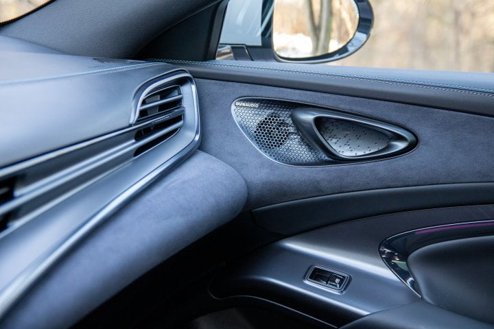 Velmi se mi líbil přechod palubní desky do čalounění dveří. Materiálově i tvarově je to moc hezky vyřešené. Na dveřích pak najdeme logo Dynaudio a stojí za zmínku, že audiosoustava velmi pěkně hraje. Ale pojďme jezdit.