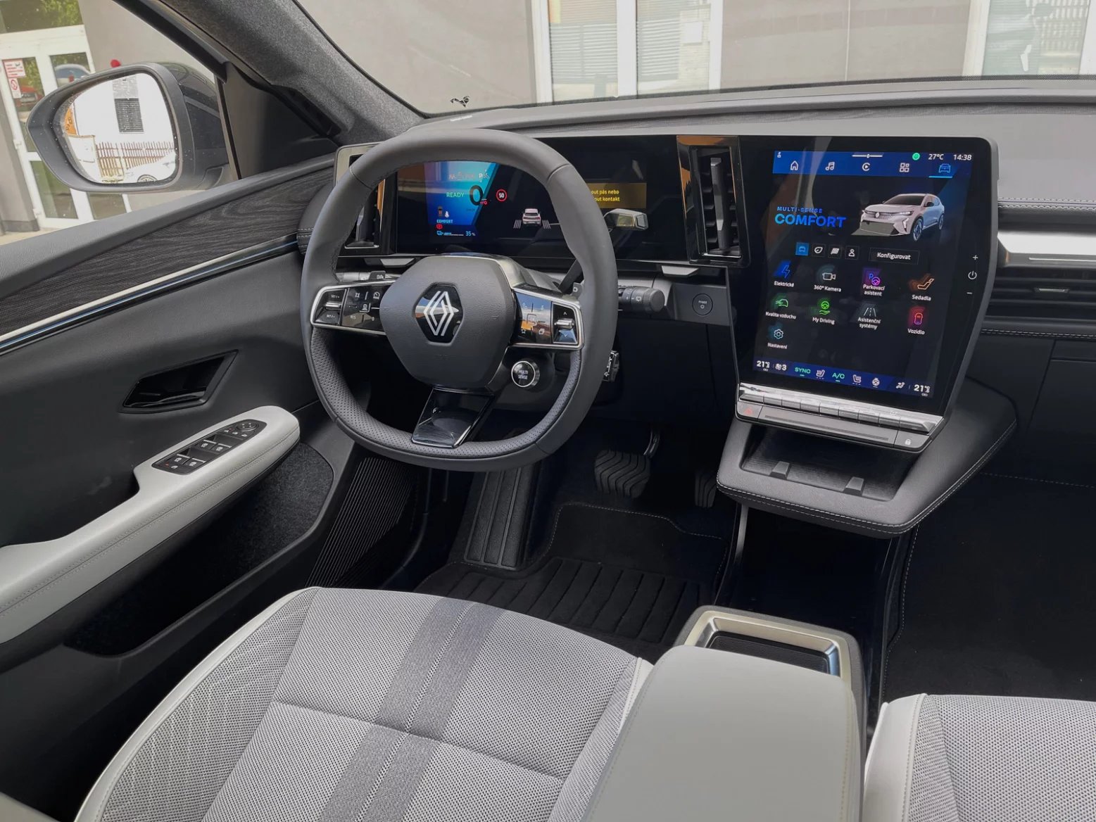 Jestliže exteriér jsme označili za německy precizní, interiér je snad ještě lepší. Kdyby vás do něj posadili se zakrytým logem a řekli vám, že jde o kabinu (dejme tomu) kompaktního elektrického BMW, neměli byste důvod pochybovat. Ať se oko podívá, kam chce, stěží najde něco ke kritice. Možná ještě zajímavější ale je, že spokojen bude vedle zraku rovněž hmat. Všechny pohyblivé ovládací prvky mají jasně definovaný chod a přesnou aretaci (v Renaultu!!!) a ani když se pořádně opřete do konzoly mezi sedadly nebo mohutného panelu „dvoudispleje“, nevydají jediné skřípnutí. Na to jsme od Renaultu v minulosti opravdu nebyli zvyklí a zejména v době, kdy interiéry čtyřnásobně dražších nových mercedesů vržou jako po deseti letech provozu na nejhorší pražské dlažbě, je to pozoruhodný úspěch.