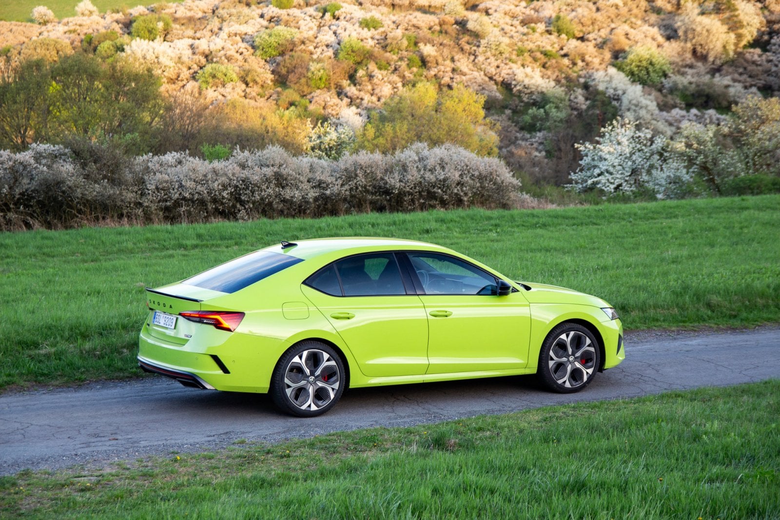 Zbožňuju tuhle barvu, kterou v ceníku najdete pod názvem Mamba Green. Měl jsem ji už na několika testovaných škodovkách a sluší jak Enyaqu, tak Octavii. Testovaný liftback s černými doplňky, sníženým sportovním podvozkem, elegantní splývavou zádí, výrazným spoilerem a tradičním červeným proužkem doplněný o fantastické Matrix-LED světlomety je podle mě ideálem trvalé krásy. To auto vypadá skvěle ze všech stran. I když se přiznám, že předfaceliftová verze se mi zepředu líbila o něco víc.