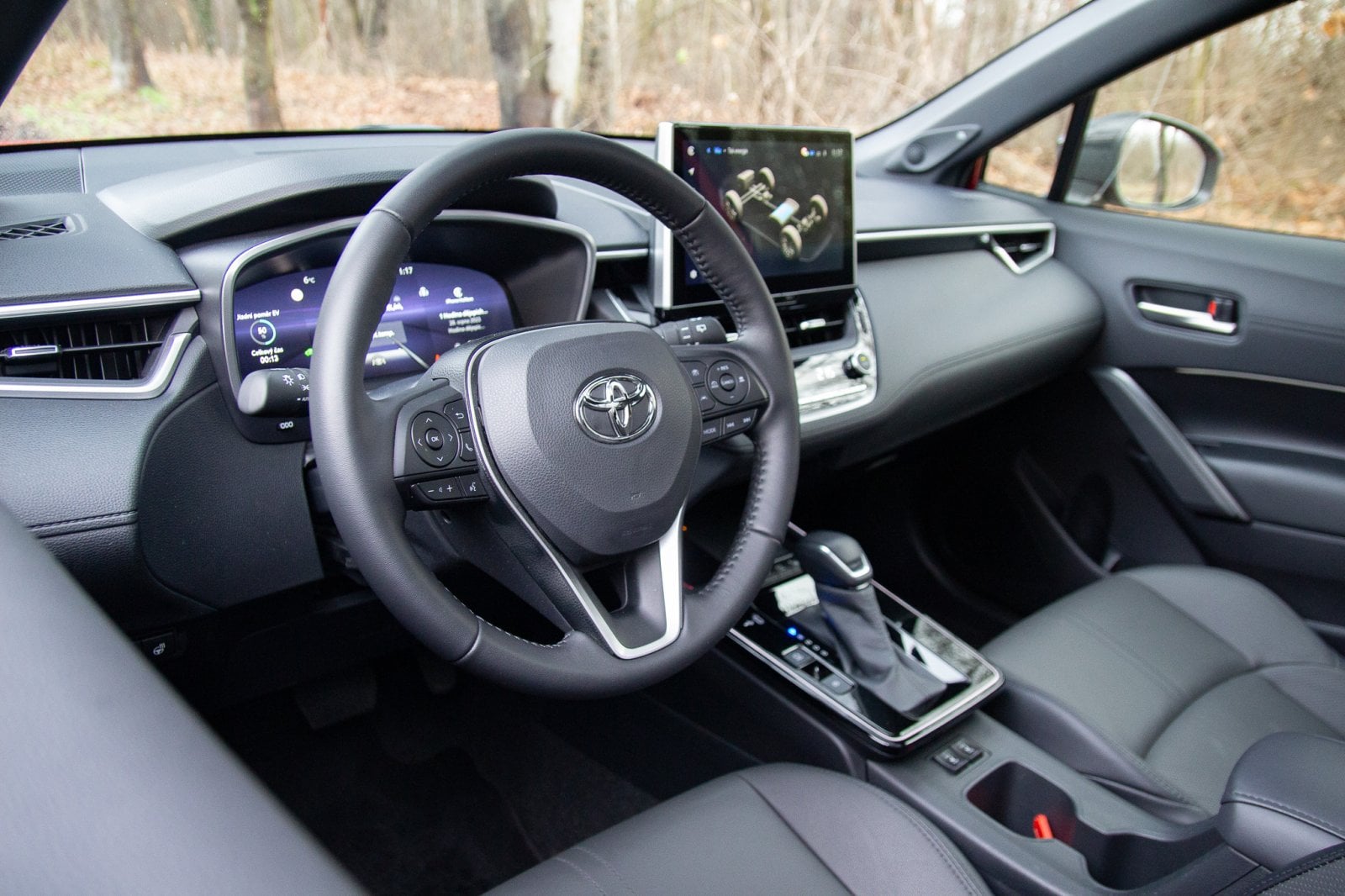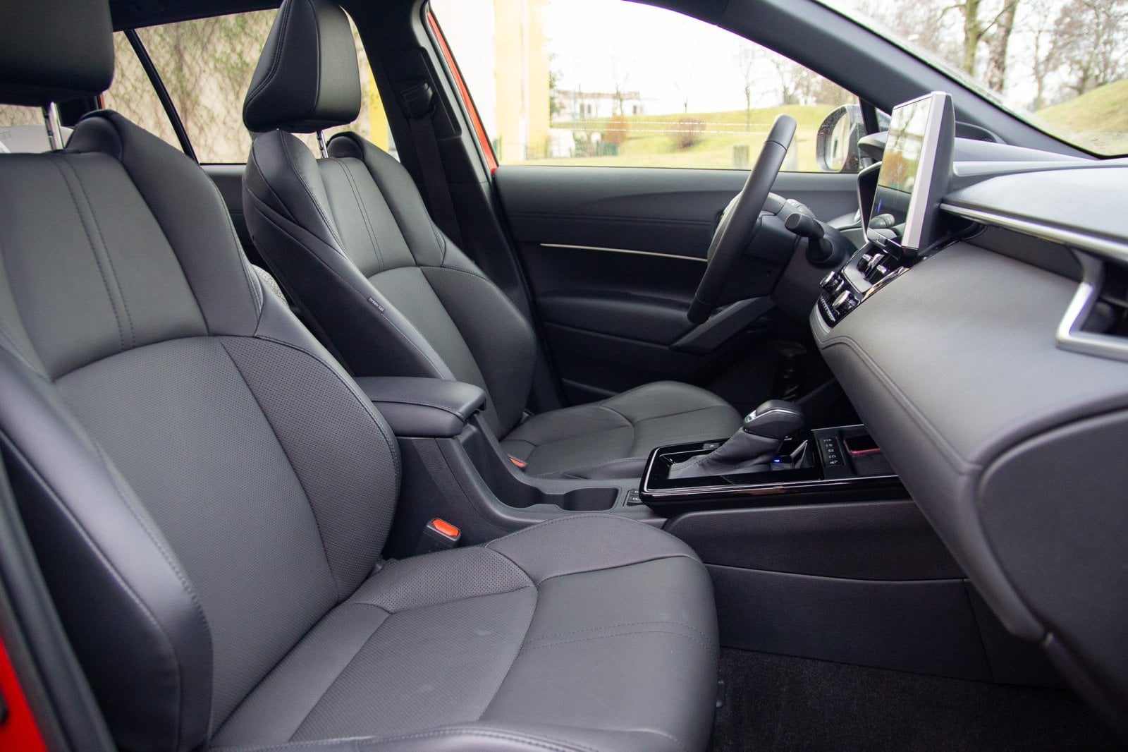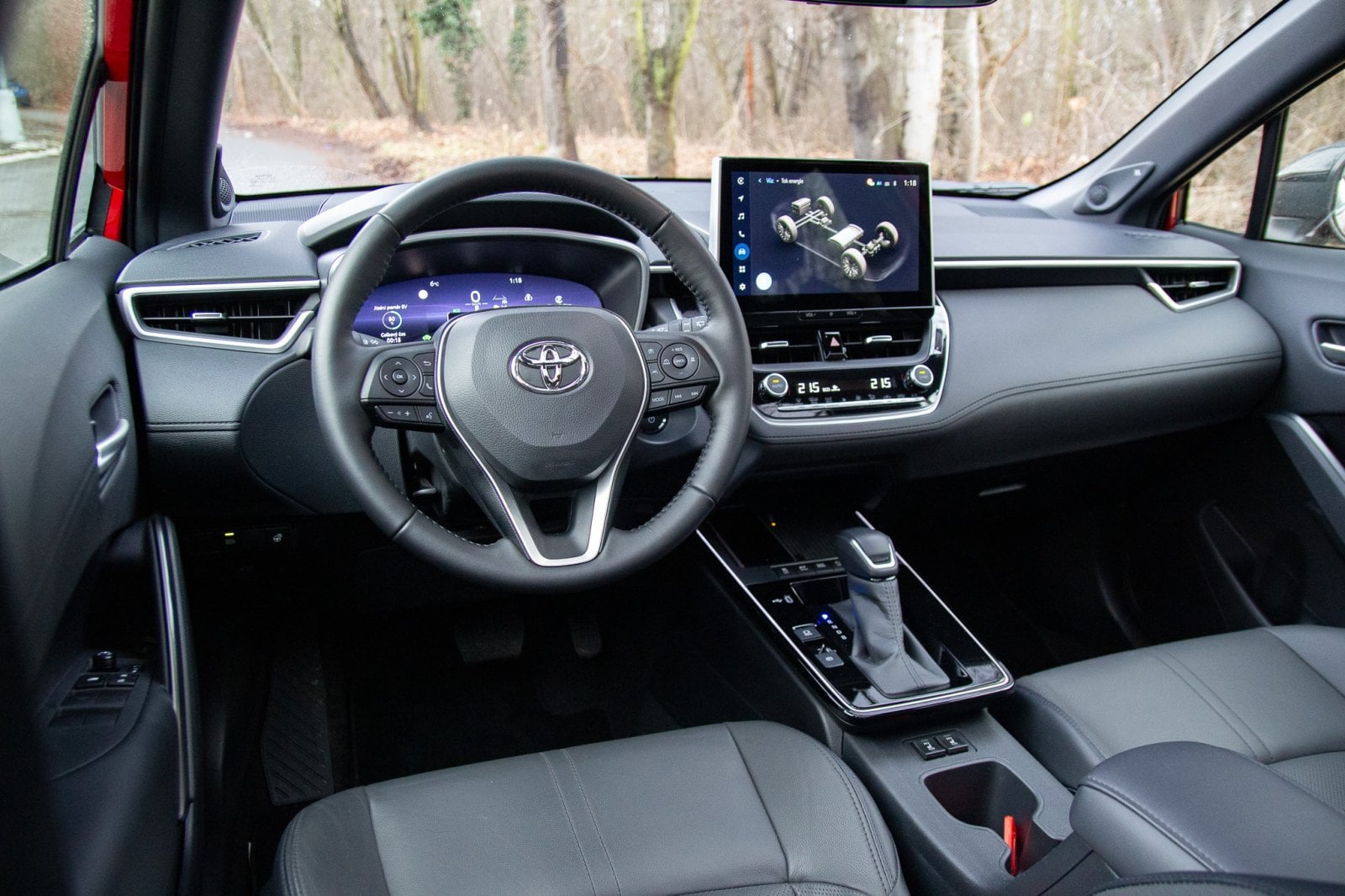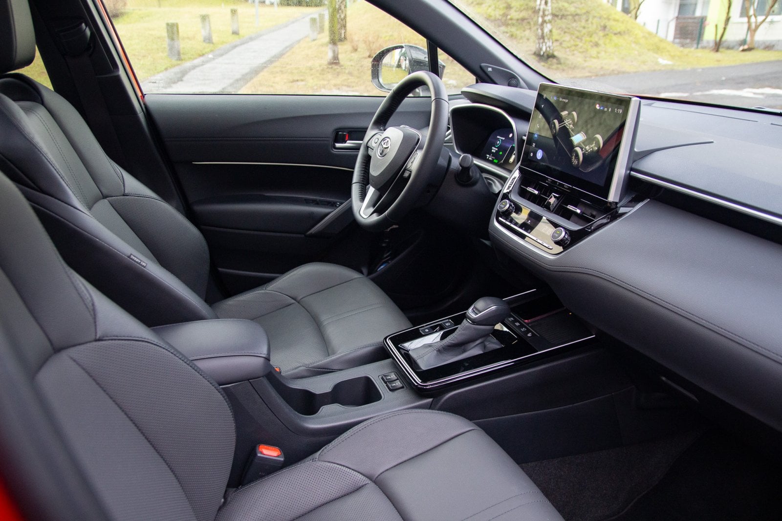 Usedám dovnitř a vítá mě známý interiér. Známý jak z osobní verze Corolly, tak z předfaceliftované verze. Změny oproti ní jsou minimální, většina z nich se odehrála v okolí přihrádky před řadicí pákou. Stejně jako zvenku se i tady díváme na velmi konzervativní ztvárnění interiéru, jaké aby v dnešním světě člověk pohledal. Některé kontrasty mi přijdou až úsměvné. Obří tlačítka vyhřívání sedadel kontrastují s moderním USB-C. Moderní podsvětlení interiéru a panel ukazující teplotu ve vozidle jak z kalkulačky, to je jako kdyby se potkala dvě různá století.