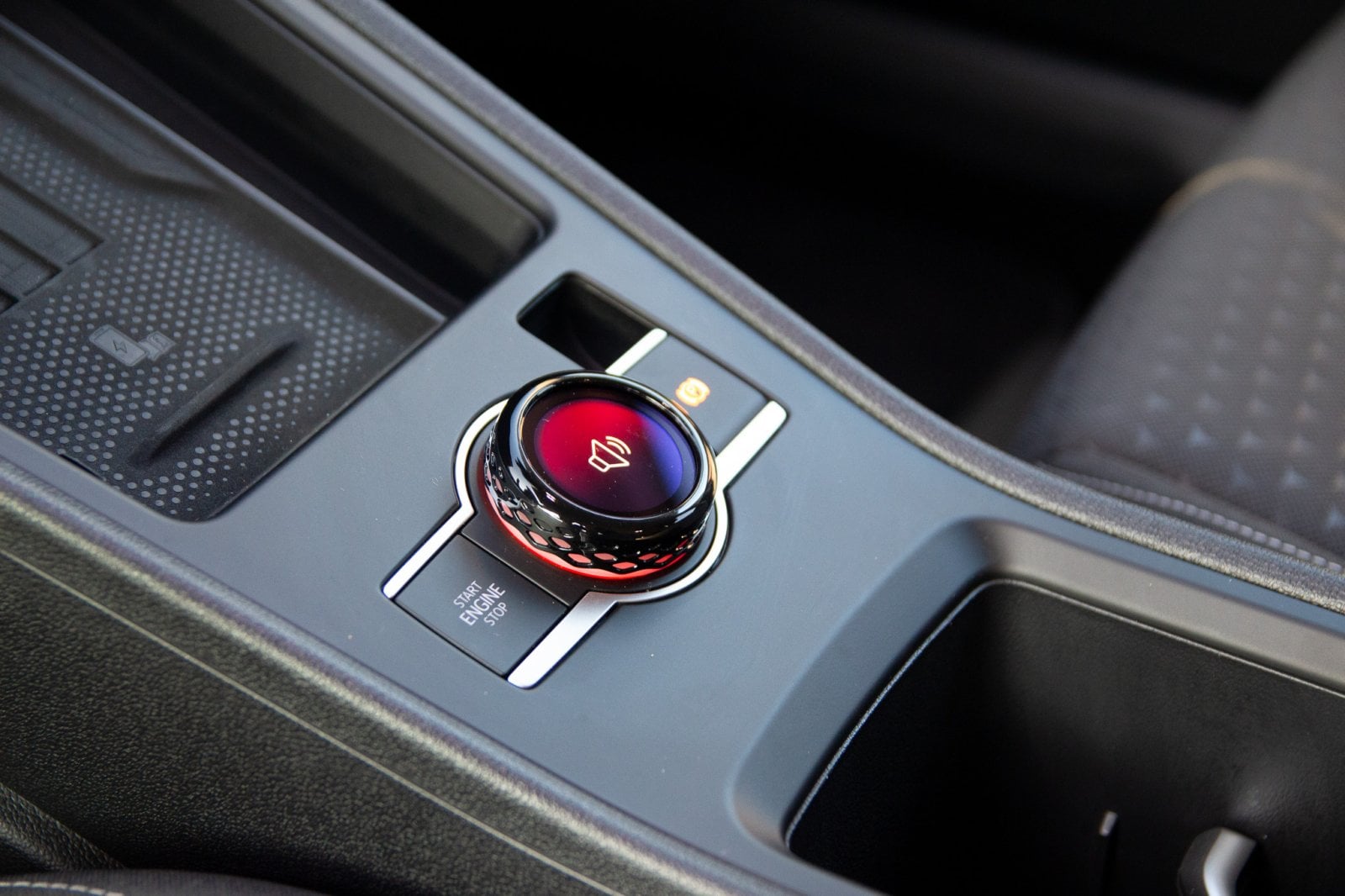 Čtvrtým odvazem je kruhový ovladač umístěný zhruba tam, kde by bývala řadicí páka. Je hezký a velmi připomíná Smart Dials ze Superbu. Ovladač má uprostřed displej a jeho stisknutím se mění kontext ovládání. Výchozí je hlasitost, po stisknutí se přepíná ovládání jízdních režimů. Hlasitost lze tedy ovládat tímto ovladačem, tlačítky na volantu, tradiční lištou pod displejem i hlasově. Jízdní profily se navíc dají přepínat i přímo v infotainmentu. Pokud jsem tento ovladač za týden použil dvakrát, tak je to hodně.