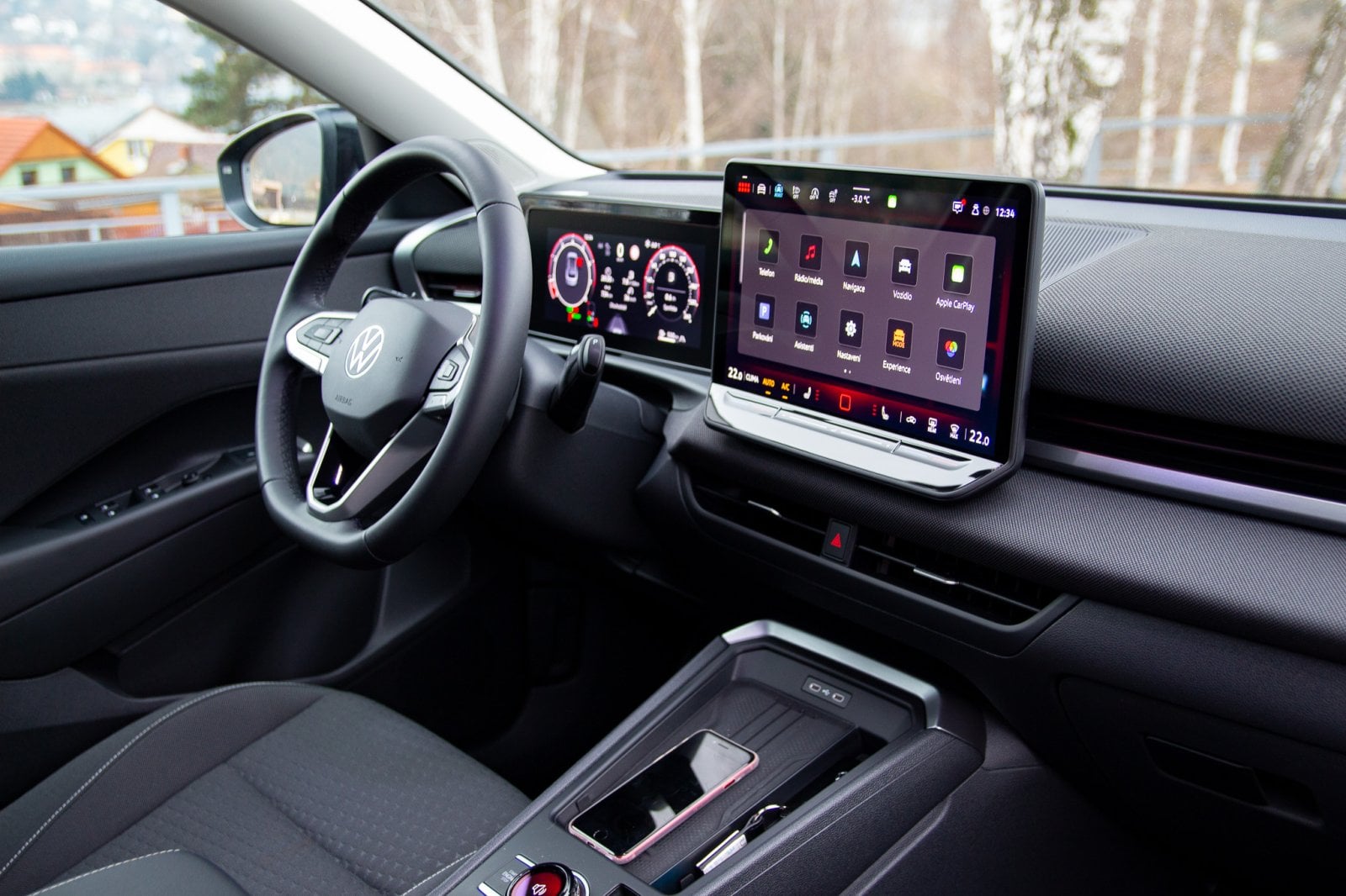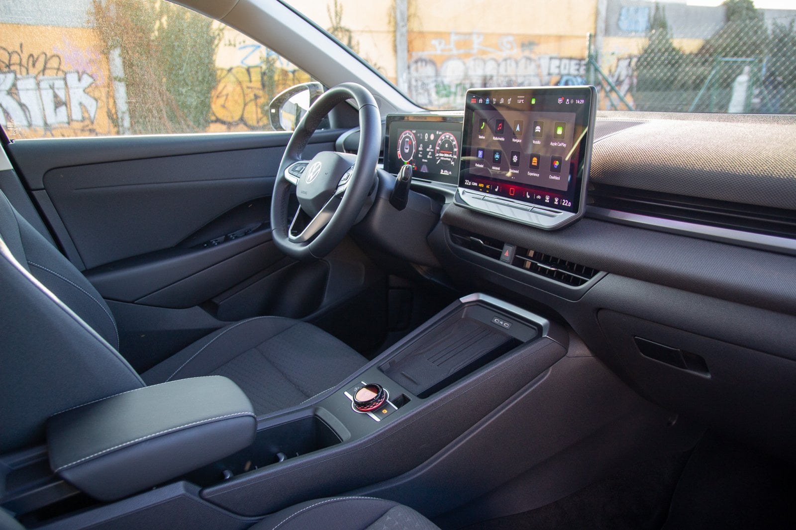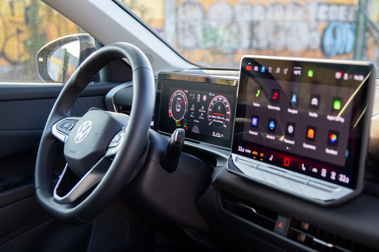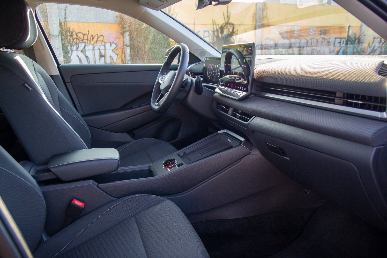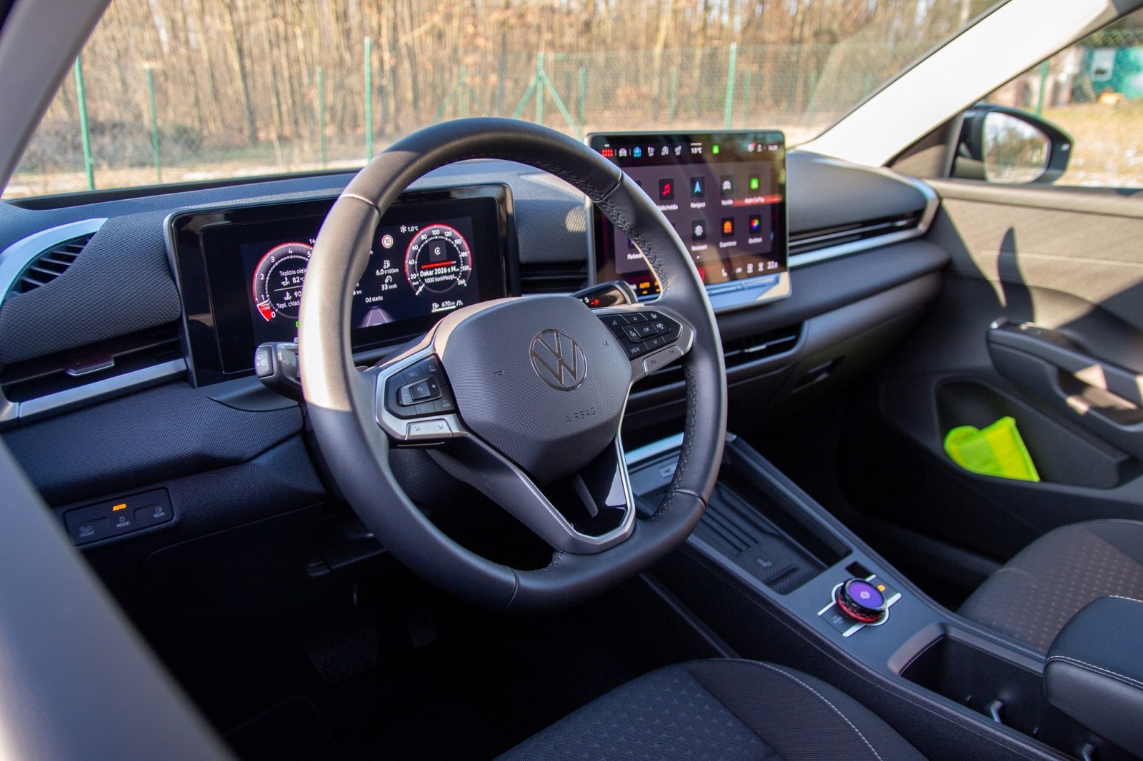 Pojďme dovnitř. Tam se výrobce držel zažitých pravidel, která vozy Volkswagen dlouhodobě pasují na špičku ergonomie, ale několik “odvazů” se tu přece jen najde. Napočítal jsem čtyři. Prvním je návrat fyzických tlačítek na volantu místo dotykových ploch, které byly velmi nešťastné. Druhým je použití látky na vrchní části palubní desky. Nejsem si úplně jistý, jak snadná bude údržba takto komplikované struktury materiálu oproti klasickému plastu. Třetím je klika dveří. Zvykl jsem si rychle, ale všem cestujícím je nutné vysvětlit, jak se dostanou ven, protože především v přítmí zadních sedadel ji málokdo najde na první pokus.