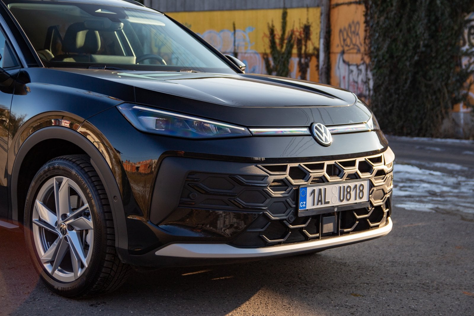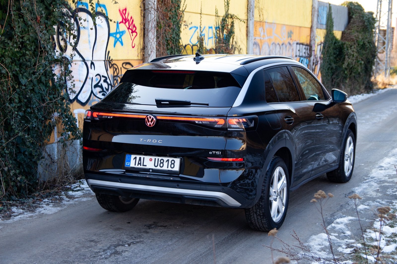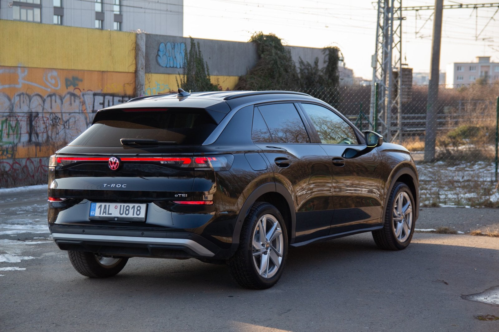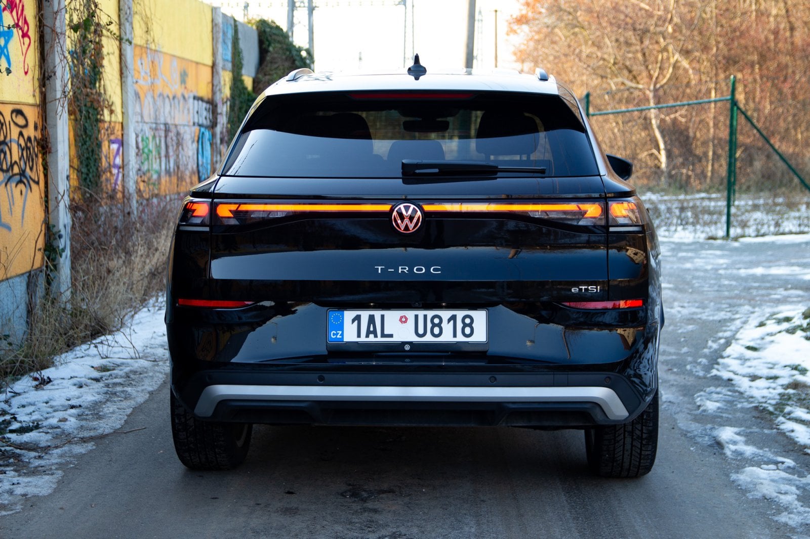 T-Roc sleduje designový směr, který jsme loni viděli u nového Tayronu. Menší světlomety v mohutné zakulacené přídi a relativně malá prosklená plocha vůči bokům auta mají dodávat dynamický vzhled. Promo snímky varianty R-Line v zářivě žluté barvě s velkými dvacetipalcovými koly opravdu působí velmi dobře. Námi testovaná verze v černé barvě s menšími koly však vyznívá o poznání hůře. Nerad to říkám, ale testovaný T-Roc působí poměrně nudně. Té černé barvy až příliš, velké plochy sice částečně rozbíjí osvětlená linka mezi světlomety, ale nejsem si jistý, zda to stačí.