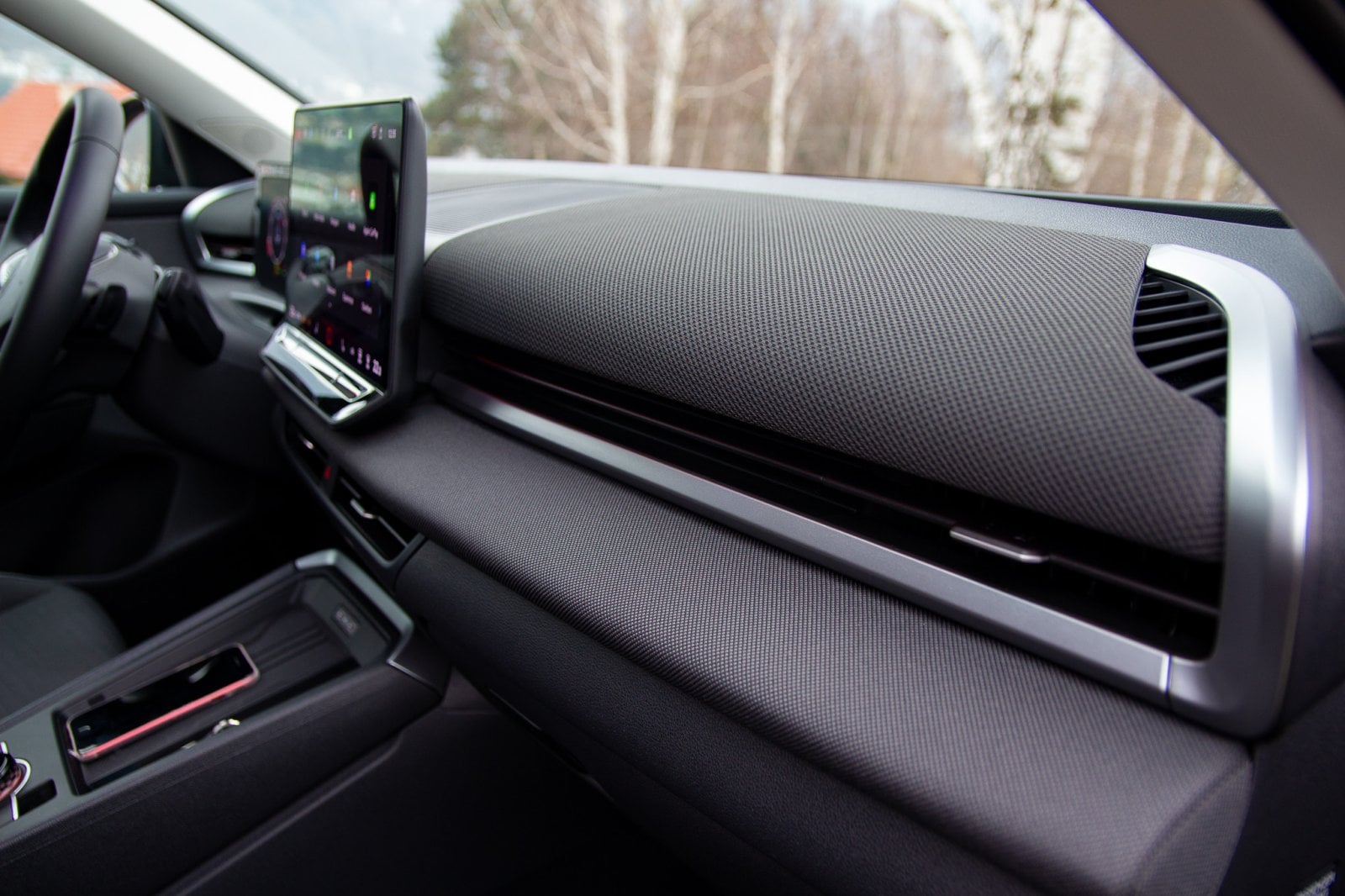 Při dalším rozhlížení interiérem samozřejmě nepřehlédnu velkou obrazovku infotainmentu. Systém už je prakticky bezchybný a patří k absolutní špičce. Skvělá je možnost personalizace rychlých zkratek, systém funguje okamžitě po startu motoru a celkově působí velmi dospěle. Pod displejem je velká polička na mobilní telefon s chlazeným indukčním nabíjením. Vedle ní se nachází nenápadná štěrbina přesně na klíč nepravidelného tvaru, což si zaslouží pochvalu. Překvapilo mě jen nahrazení klasické schránky pod loketní opěrkou, která dříve navazovala na úložný prostor před ní. Teď už ale vyrazíme na cestu.