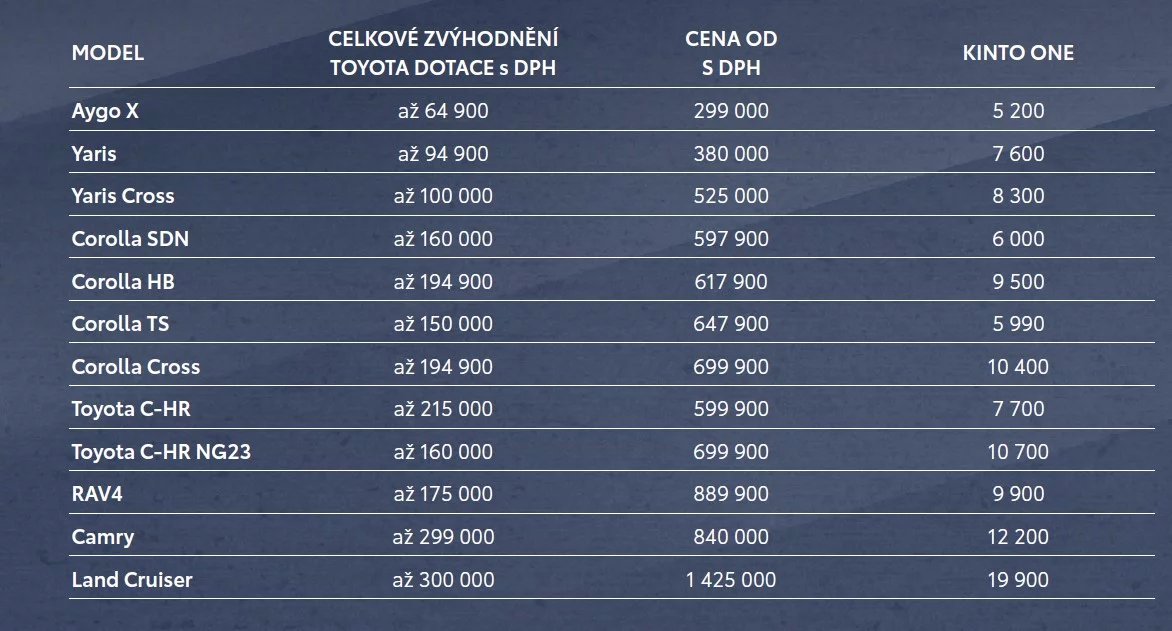 Toyota na tiskové konferenci oznámila také spoustu akčních cen. Slevy se pohybují v řádu desítek až stovek tisíc. Třeba dosluhující model Camry teď díky slevě až 299 tisíc startuje částkou 840 000 Kč včetně DPH, čímž se dostává na ceny konkurující Škodě Octavia.